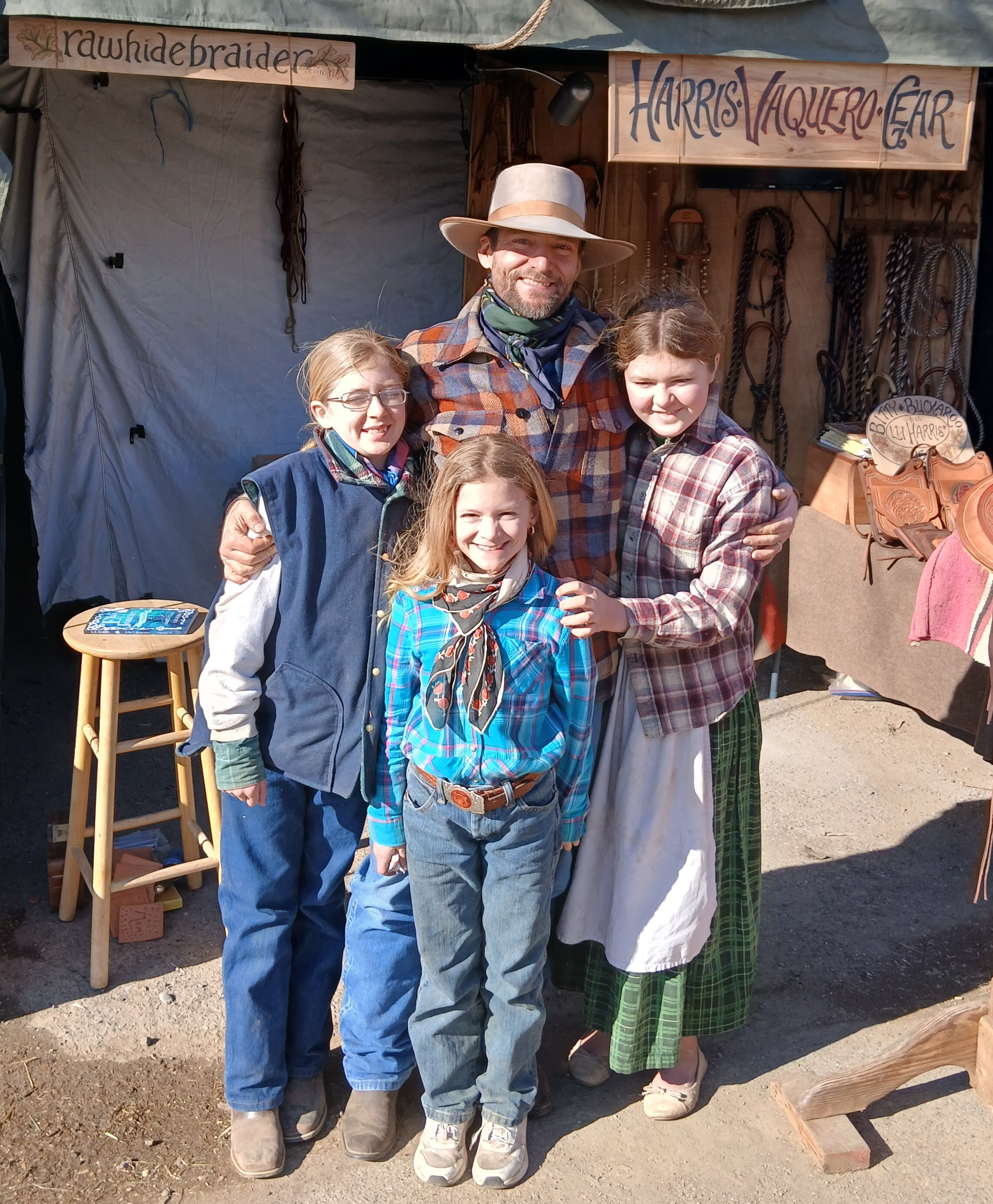 The Harris Vaquero Gear shop is busy now. Daughters Caitrona and Mairi are apprentices. We usually have students and colleagues in the shop. Jake Ellis makes HFG saddles. I am the janitor, but I also scrape hides, braid, teach, and write. Rebekah teaches our children, and helps me in so many ways. She is the great blessing of my life.