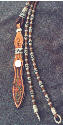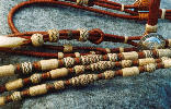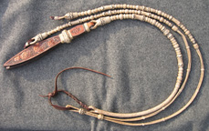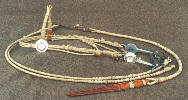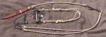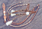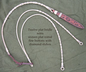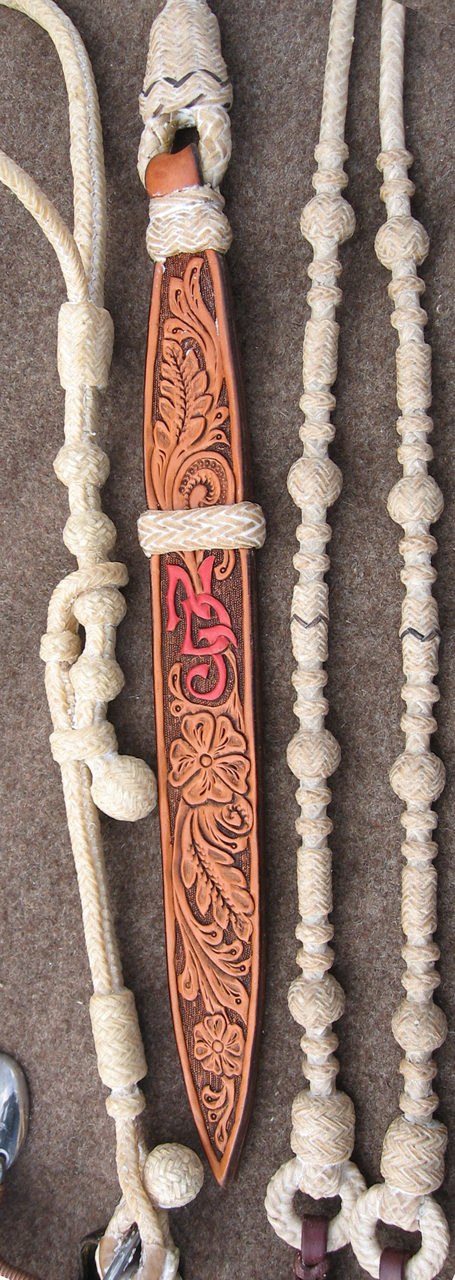 Eight plat bridle reins have a square cross section. The strings are heavy, well beveled, and have no core. Finished buttons are intricate and solid The only knots that slide are the sliders; there are two of them. Forty two inches is the standard length for closed reins, and the romal is the same. Our poppers are wide and long—reminiscent of the California quirt. Your brand or initials are caved there at no extra charge. Our twelve plat romal is stiff enough to reach with, yet the connector is limber so the reins will not cue the romal. We pay attention to choosing exactly the right weight and curing of hides to make reins—these are heirlooms as well as tools.
